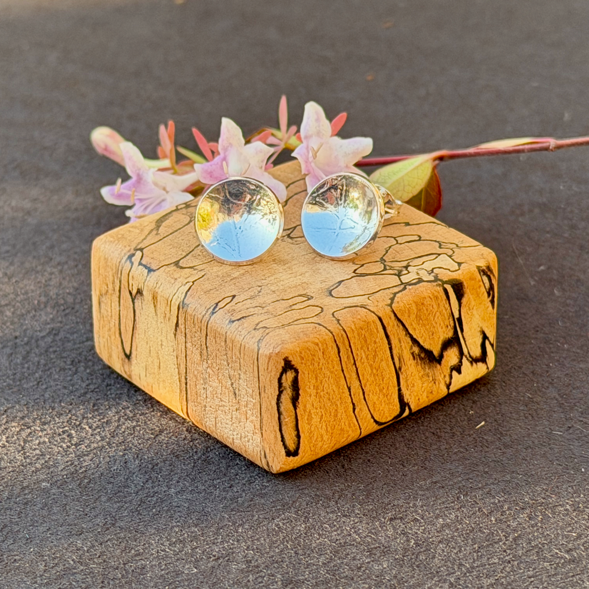Hand crafted Sterling Silver studs with a concave disc design and subtle geometric etching. Modern, minimalist and versatile for everyday wear.