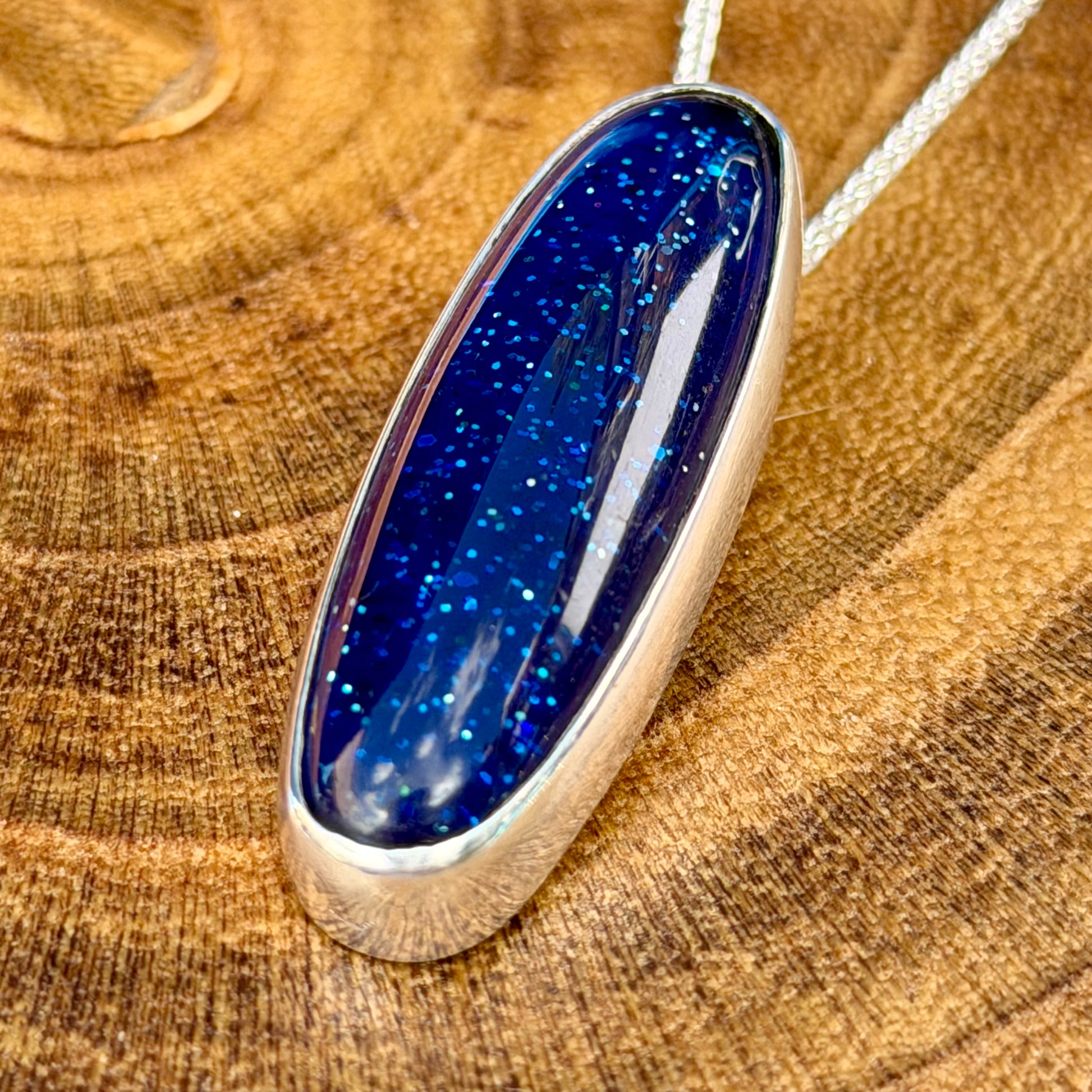 This striking pendant features a rich, midnight-blue resin cabochon set in a polished Sterling Silver bezel with a hidden bail and suspended from an 18” Spiga chain. Its subtle sparkle captures the beauty of the night sky, creating a modern and elegant piece.