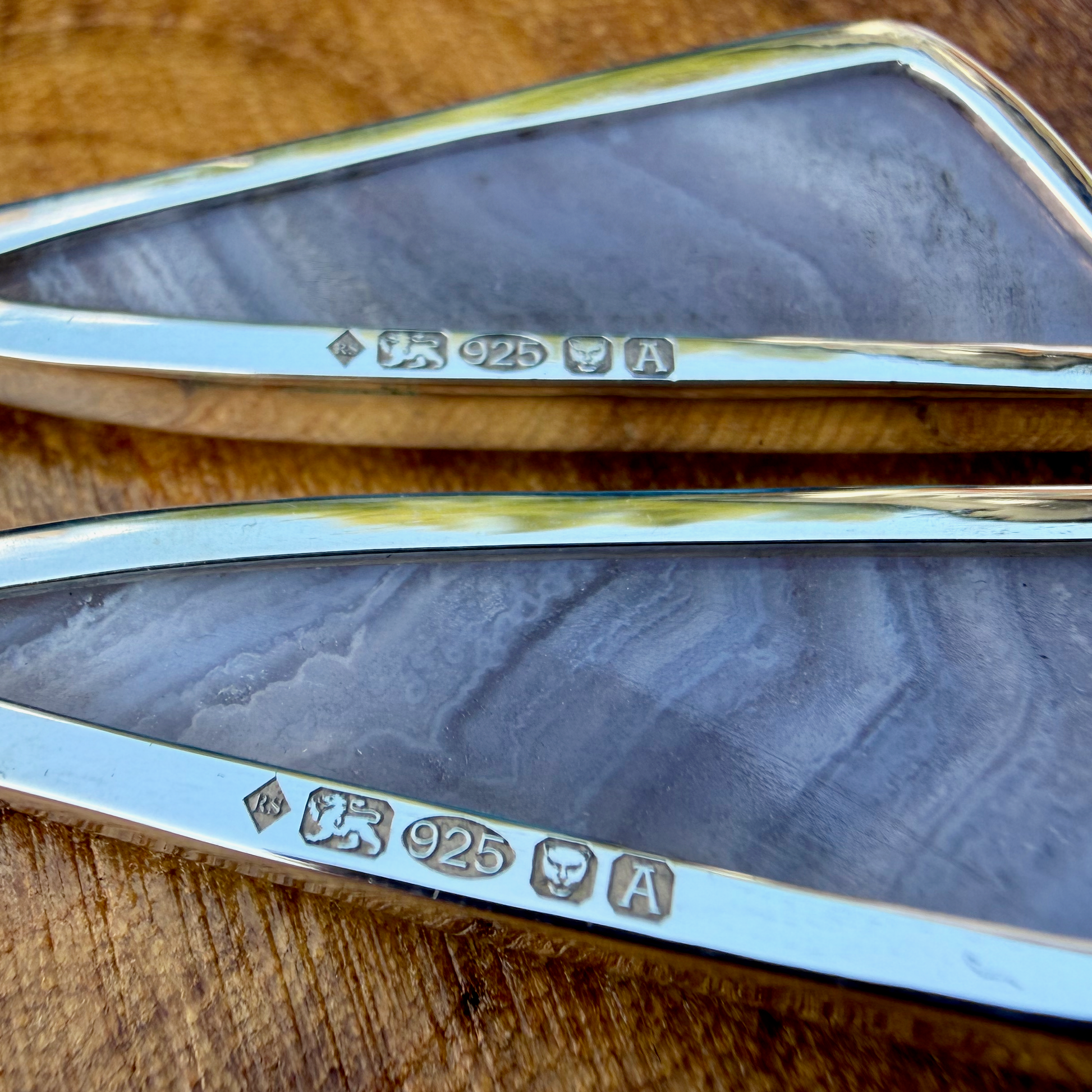 Elegant and distinctive, these handcrafted drop earrings feature polished blue agate framed in sterling silver. The soft tones of blue and grey create a subtle yet striking contrast against the sleek silver. Perfect for both everyday wear and special occasions, these earrings bring a calm, modern sophistication to any look.